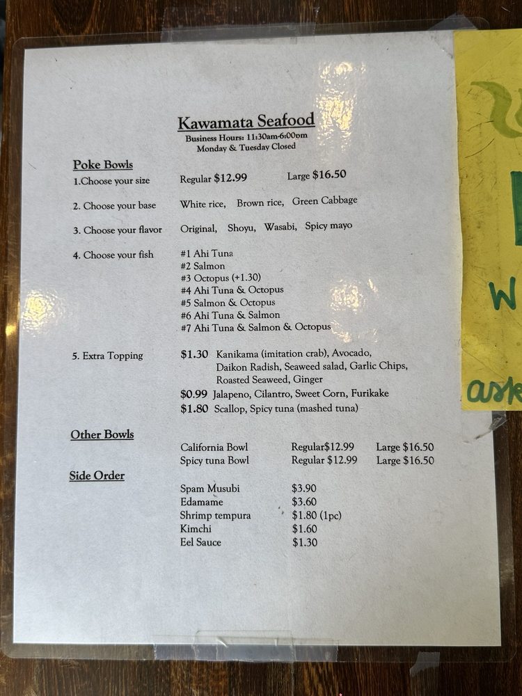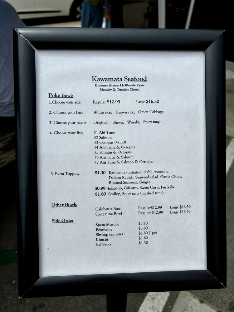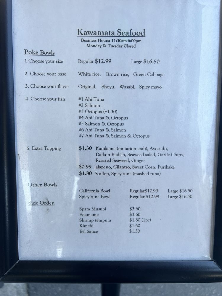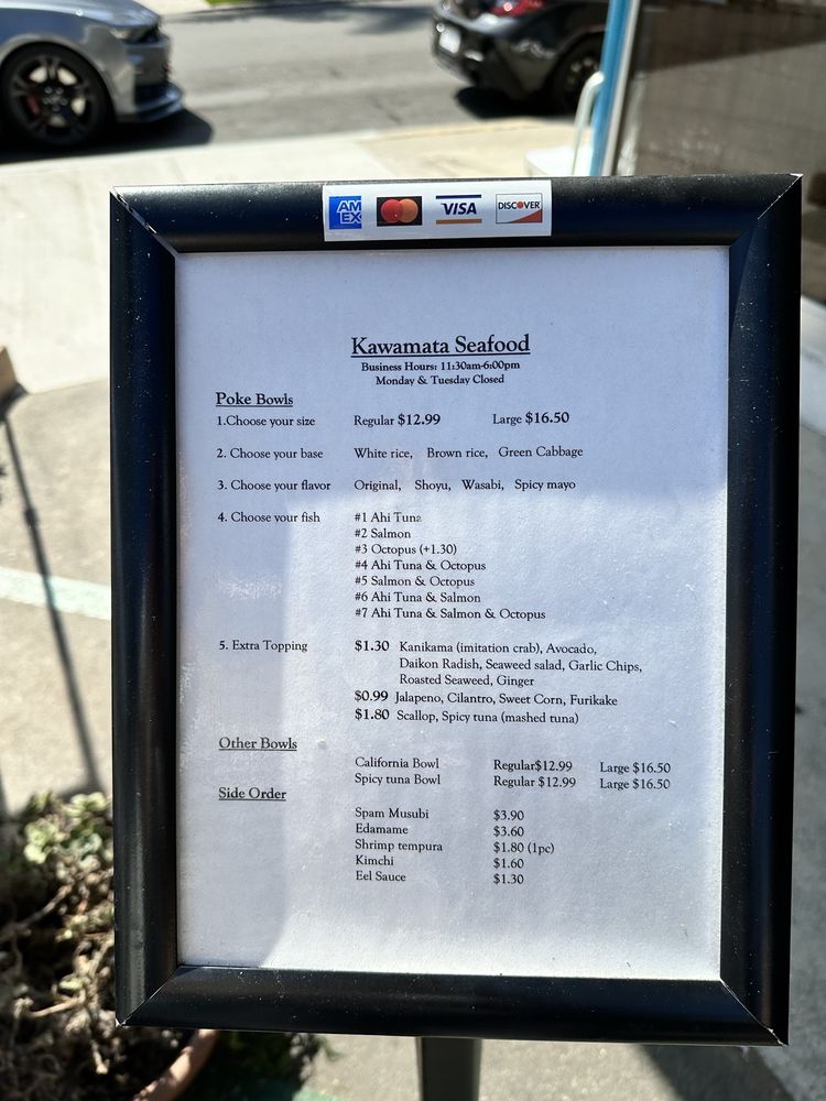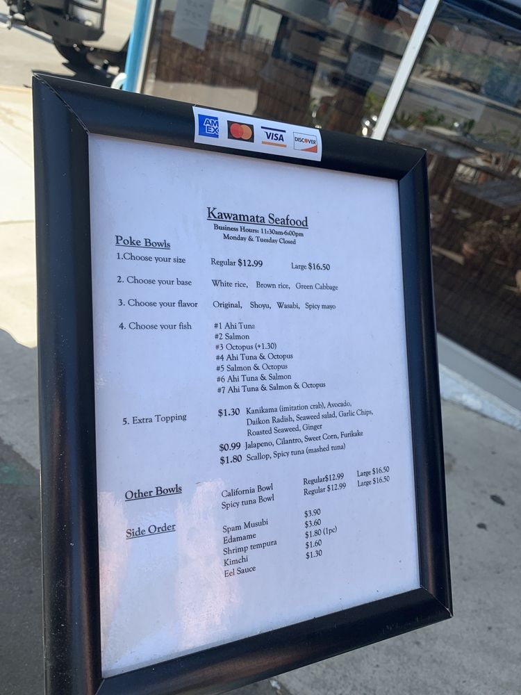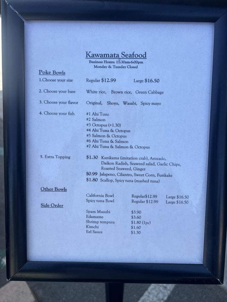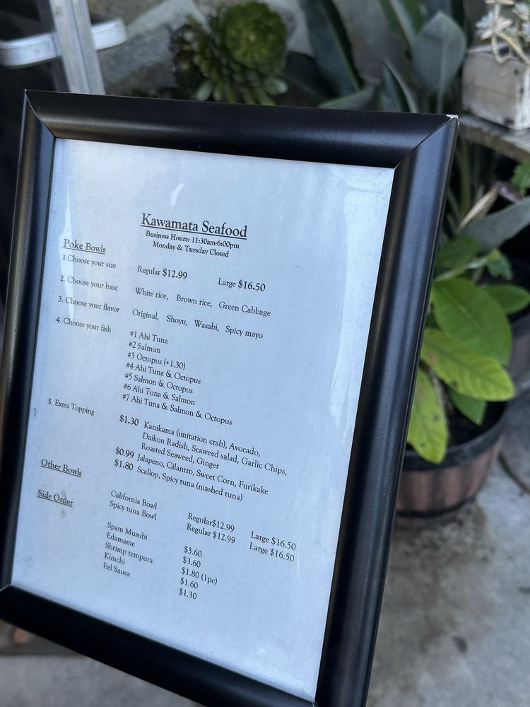 Kawamata Seafood in Dana Point, CA offers a Hawaiian-style poke menu with high-quality fish options like ahi tuna, salmon, and octopus. Customers praise the generous portions and fresh ingredients, noting the exceptional fish quality and well-balanced flavors. The house sauce adds a delicious citrusy tang to enhance the overall taste. With limited indoor seating but ample outdoor seating, Kawamata is perfect for a casual and classy dining experience. The small menu ensures quick and easy ordering, with options for customization to suit your preferences. Overall, Kawamata Seafood stands out as a top spot for authentic and satisfying poke bowls in Orange County.